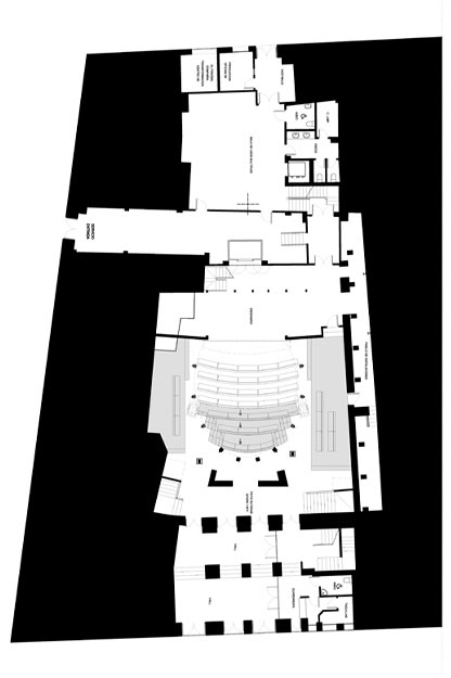 Se dispusieron en el patio de “herradura” tres gradas desmontables al fondo, con curvatura distinta, más pronunciada cuanto más se aleja de la escena. El resto de filas se compone de bancos en módulos de tres sobre el pavimento de madera. |