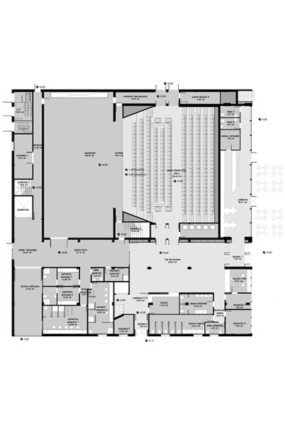 Dos cuerpos adosados que reflejan el carácter de cada unos de ellos. Uno irregular y singular para el Teatro y un paralelepípedo peraltado en el caso del Centro Cultural. El vestíbulo principal conecta las funciones.