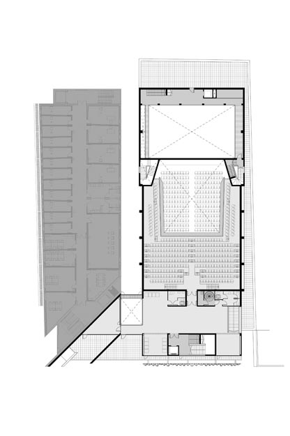 Para evitar problemas de interacción acústica entre ambos edificios, interiormente se situó un patio-calle entre ambos, enfrentado al acceso y ligado a la cafetería que favorece la permeabilidad del vestíbulo y permite disfrutar de un espacio privado abierto al exterior