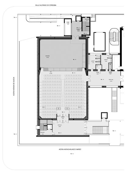 Manteniendo básicamente la volumetría original, se planteó la construcción de un cuerpo de caja escénica que emerge interiormente. Por medio de una iluminación en sus cuatro caras, además de su carácter funcional, podrá actuar de reclamo visual hacia el exterior.